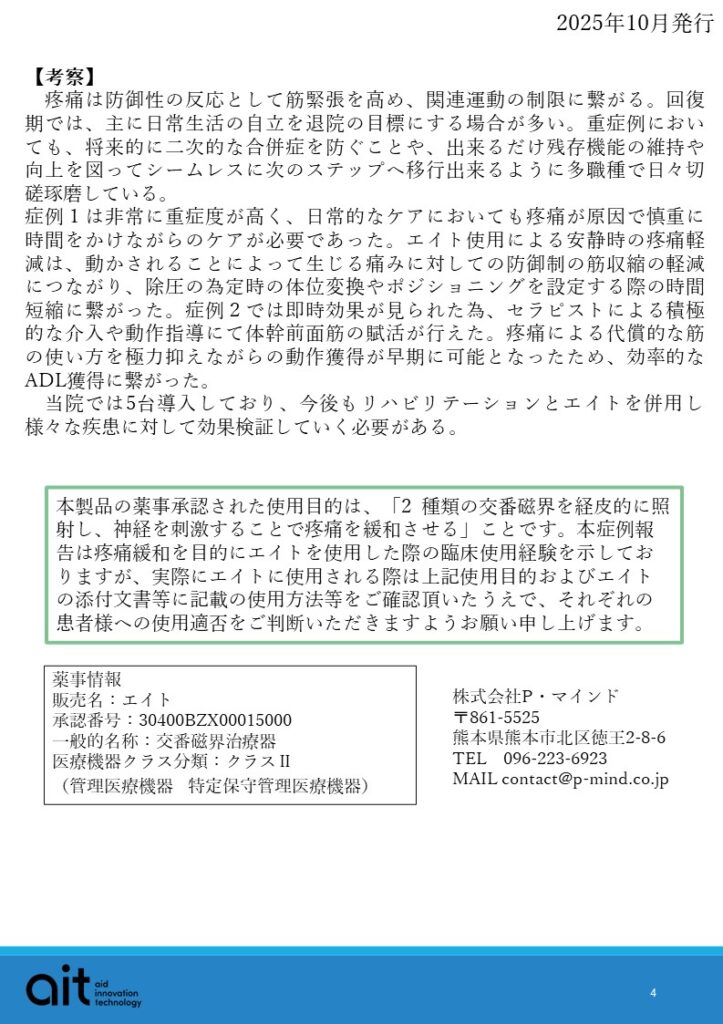 Case report ケースレポート 33.交番磁界治療器エイトを用いて 疼痛軽減を認めた回復期病棟での症例報告 整形外科・リハビリテーション科 著者 医療法人陽心会大道中央病院 リハビリテーション部 理学療法士 田中 省冴様 資料ダウンロード 一覧へ戻る